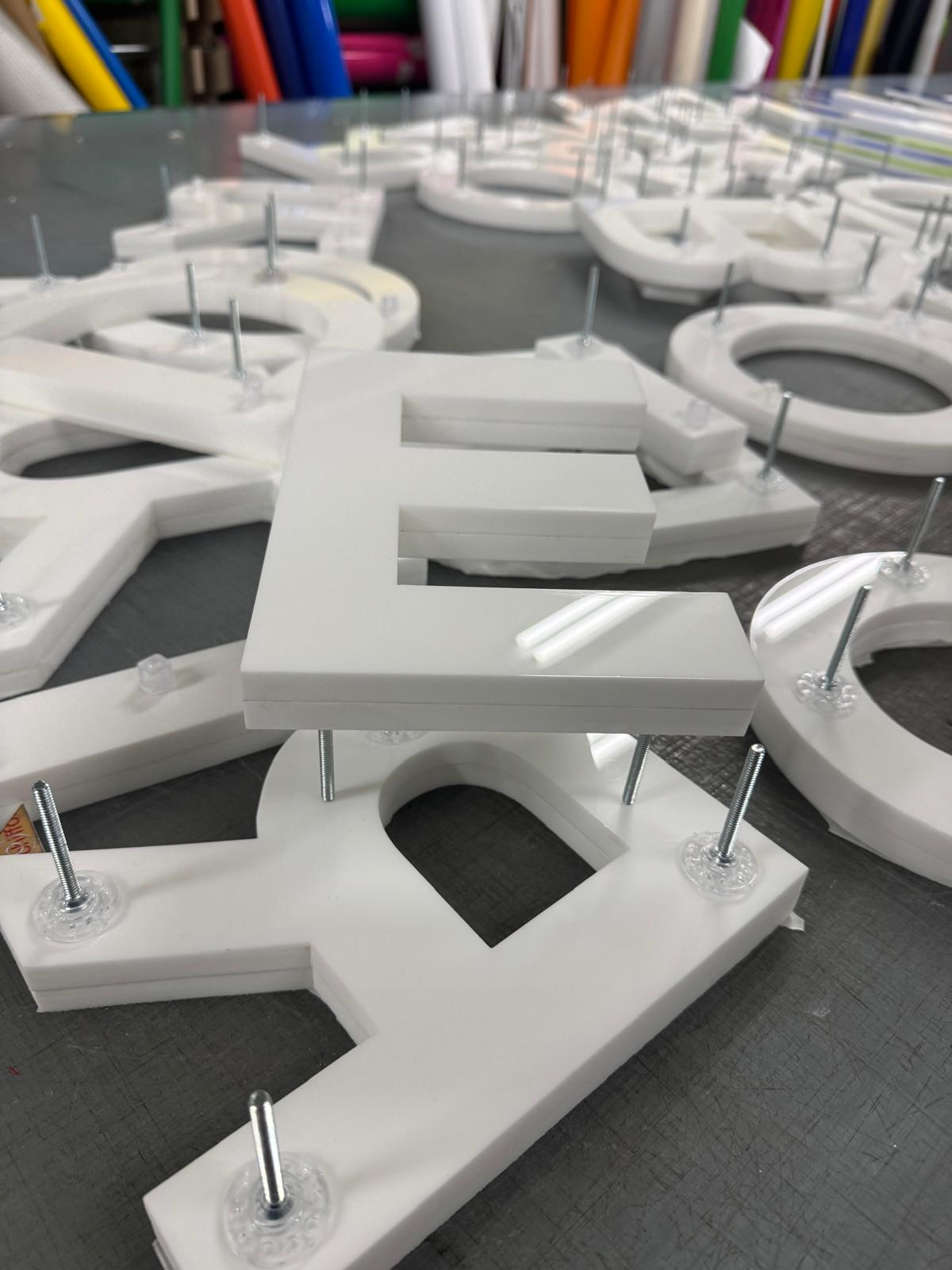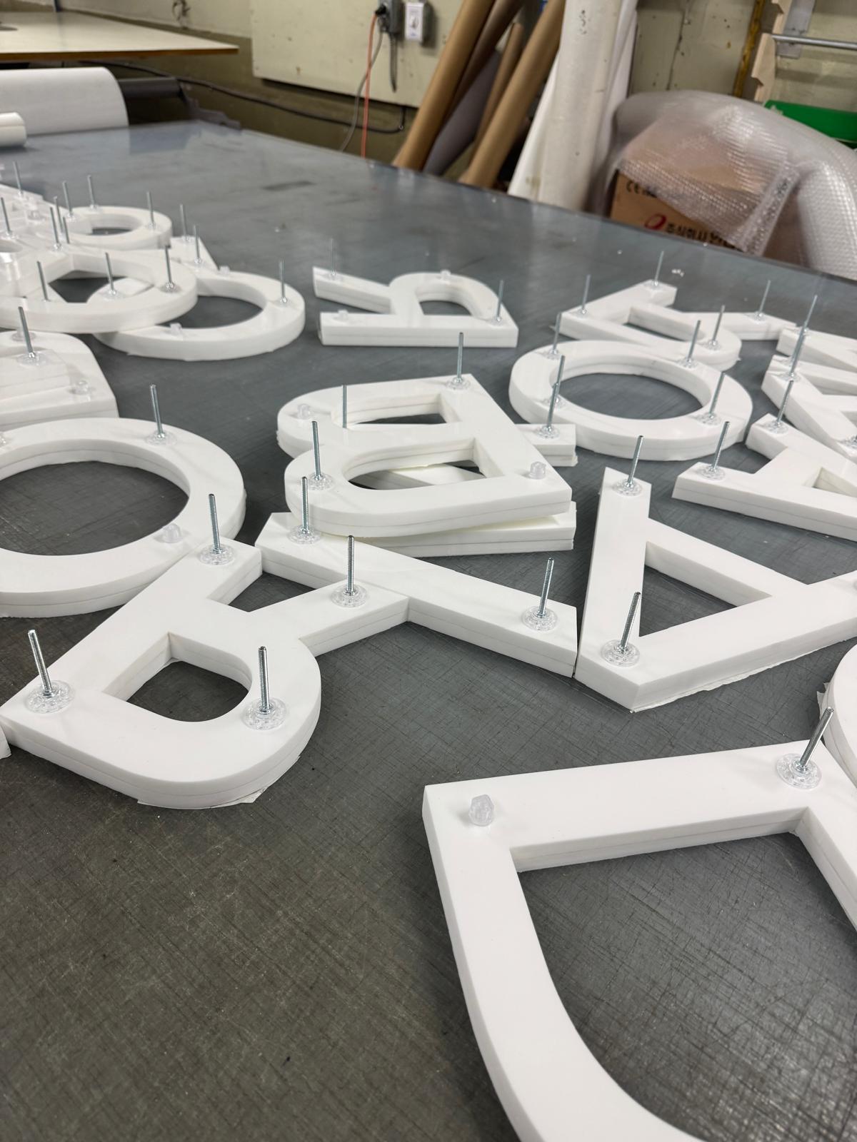 We fabricate all pin-mount letters in-house using premium acrylic or aluminum, ensuring clean edges, perfect alignment, and a flawless finish. Installation templates are provided for easy pin placement.
